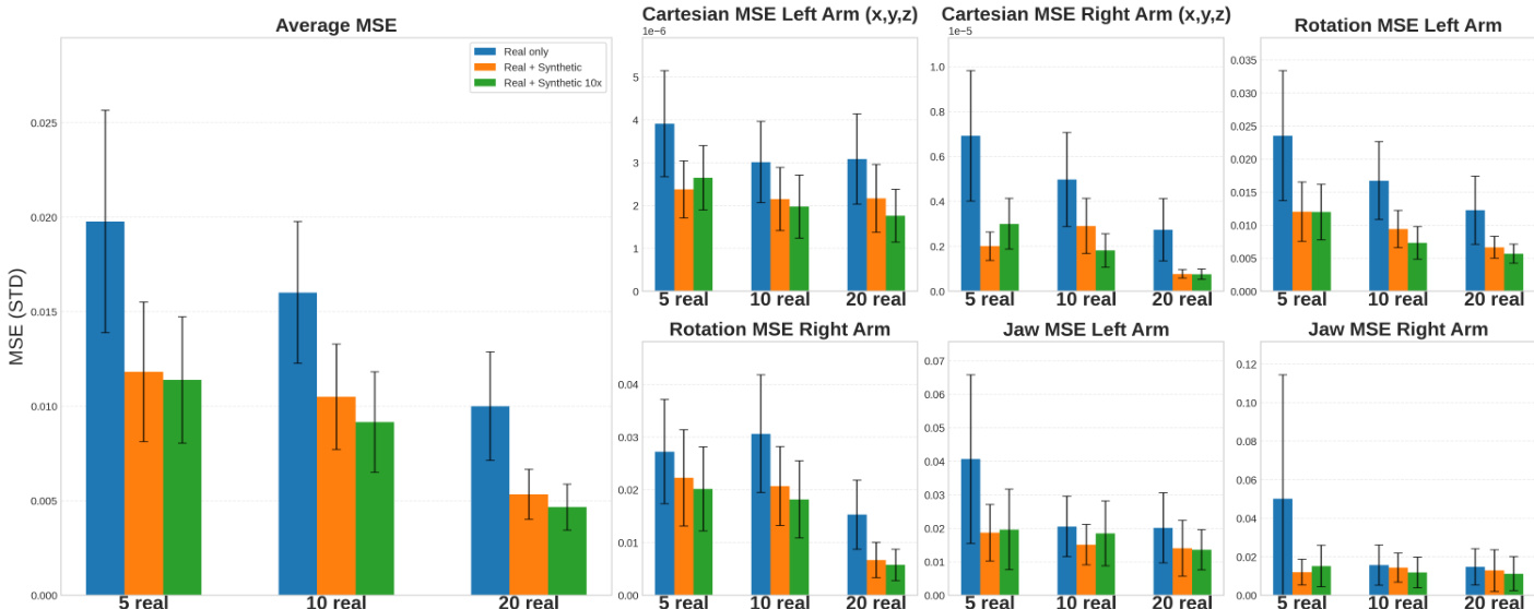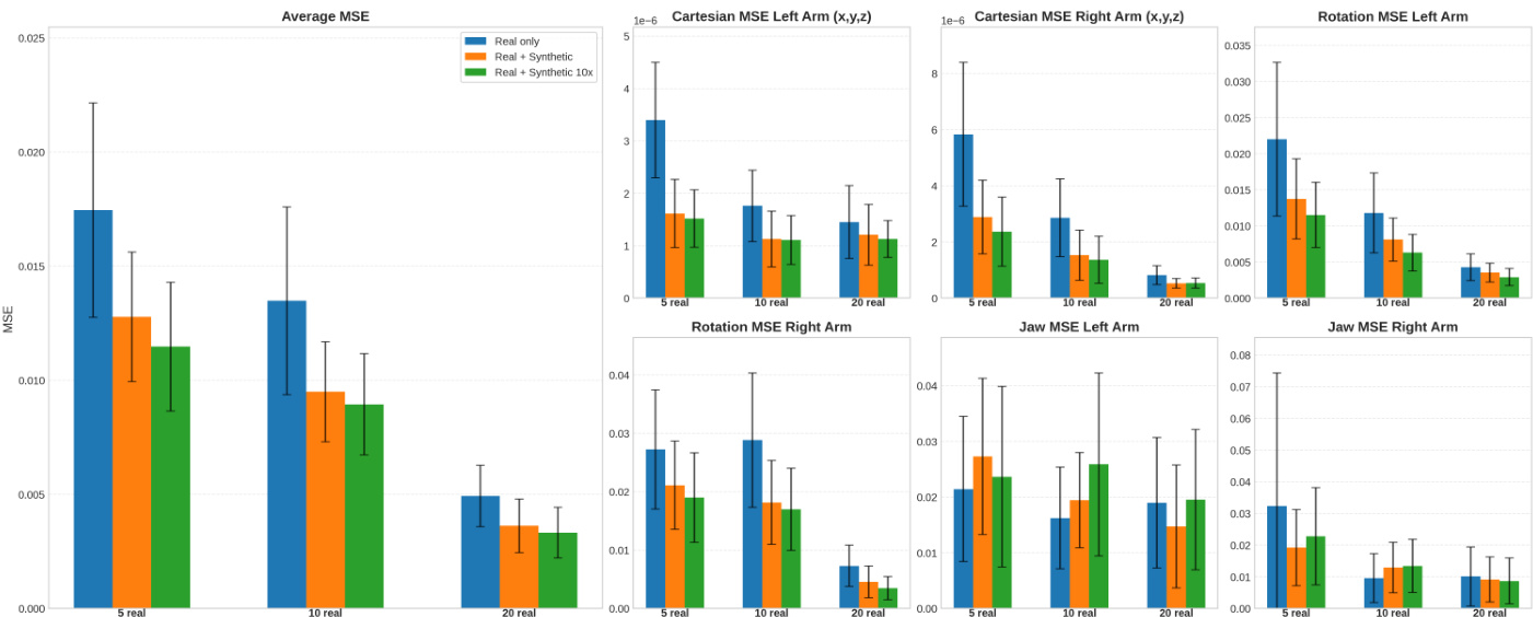 • Showed that synthetic data from SurgWorld enhances downstream robotic policy learning: using 56 or 560 synthetic videos reduced trajectory MSE across cartesian, rotation, and jaw actions compared to real-only training, with consistent improvements across varying real data sizes and policy models (GR00T, π₀.₅).