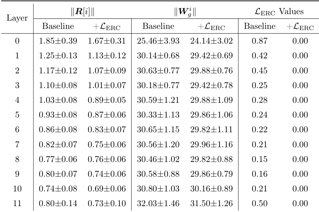 - The ERC loss introduces negligible overhead—0.2–0.8% in real-world distributed training—due to its low FLOP cost (0.18–0.72% of base forward pass), confirmed by both theoretical analysis and empirical throughput measurements.