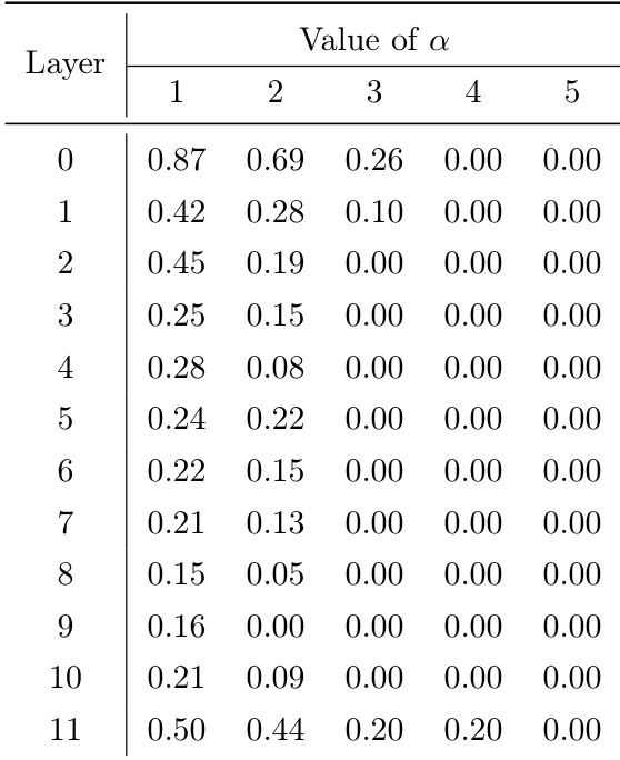 The authors use the ERC loss to investigate expert specialization by varying the coupling strength parameter α, and the table shows that as α increases, the ERC loss decreases across all layers, indicating reduced specialization. This trend is consistent with the analysis that higher α values weaken the coupling constraint, leading to more homogeneous experts and lower performance gains.