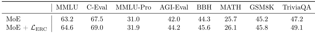- ERC loss is effective at scale: on 15B models with n=256 and K=8, it improves performance across challenging benchmarks including MMLU-Pro, AGI-Eval, MATH, and GSM8K, despite AoE failing to train due to excessive cost.
