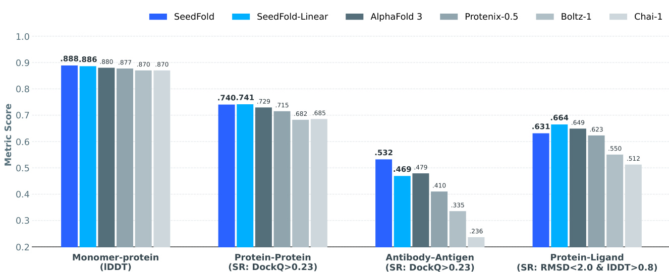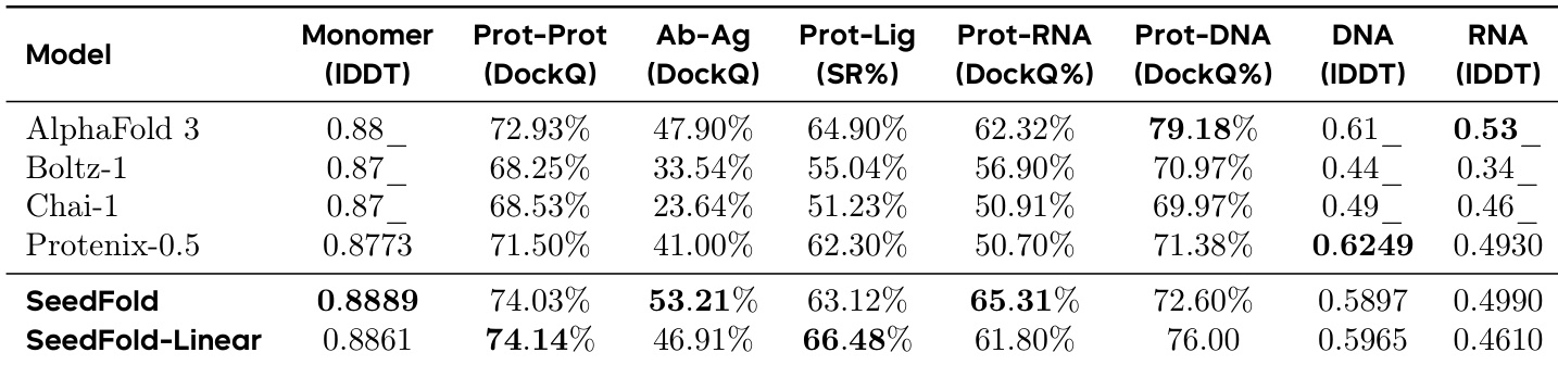 - SeedFold (512-width, vanilla triangular attention) achieves 0.8889 lDDT on monomers and 53.21% DockQ on antibody-antigen interfaces, outperforming AlphaFold 3; SeedFold-Linear (384-width, GatedLinearTriAtt) leads in protein-ligand (66.48% success) and protein-protein interfaces (74.14% DockQ).