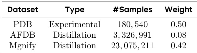 - The AFDB dataset contributes 3.3 million structures from AlphaFold2-predicted models on UniProt sequences. Sequences are clustered at 50% identity, and structures with pLDDT below 0.8 are filtered out. Short monomers (under 200 residues) are sampled with a probability of 0.08, followed by uniform sampling within length ranges.