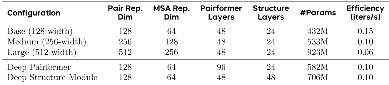 The authors use a scaling strategy to increase model capacity, showing that larger models with higher width and more parameters achieve greater performance, as seen in the transition from Base to Large configurations. Results show that increasing the Pairformer width significantly impacts efficiency, with the Large model achieving lower iterations per second compared to smaller variants, while the Deep Pairformer and Deep Structure Module configurations demonstrate improved capacity at the cost of computational speed.