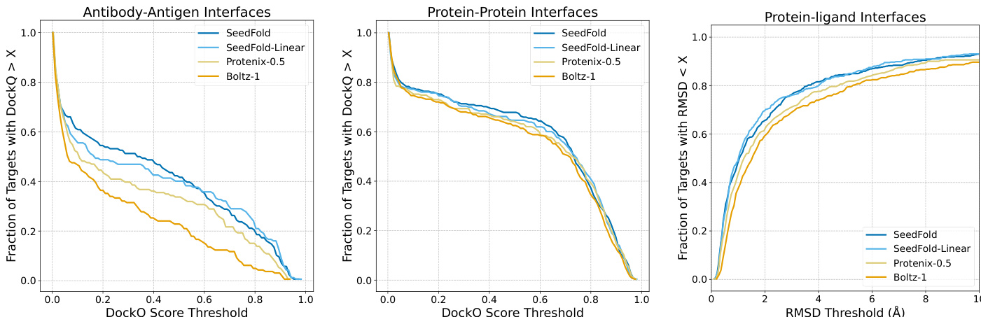 Results show that SeedFold achieves superior performance in antibody-antigen interface prediction, outperforming all other models across the entire DockQ score range. In protein-protein and protein-ligand interface predictions, both SeedFold and SeedFold-Linear maintain a consistent advantage over Protenix-0.5 and Boltz-1, with SeedFold-Linear achieving the best performance in protein-ligand tasks.