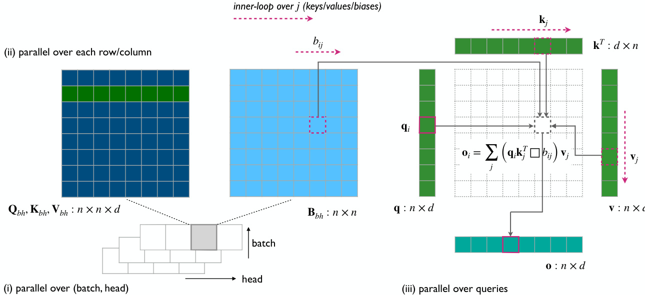 The Gated Linear Triangular Attention variant, which uses a pointwise matrix multiplication, disrupts the matrix chain product, preventing the use of the right product trick. To mitigate this, the authors develop a tiled version of linear attention optimized for reducing memory footprint on CUDA devices. The implementation of this module is further detailed in the Triton kernel, which computes the output O and its gradients. The kernel treats the batch and head dimensions as a single batch dimension and parallelizes over the first dimension of size n, iterating over the second dimension to aggregate the result and avoid materializing the full n×n matrix. The architecture of the Linear Triangular Attention module includes a normalization and gating step on the output, following the Lightning Attention design, which has proven effective in large language models. The figure below illustrates the implementation of this kernel.