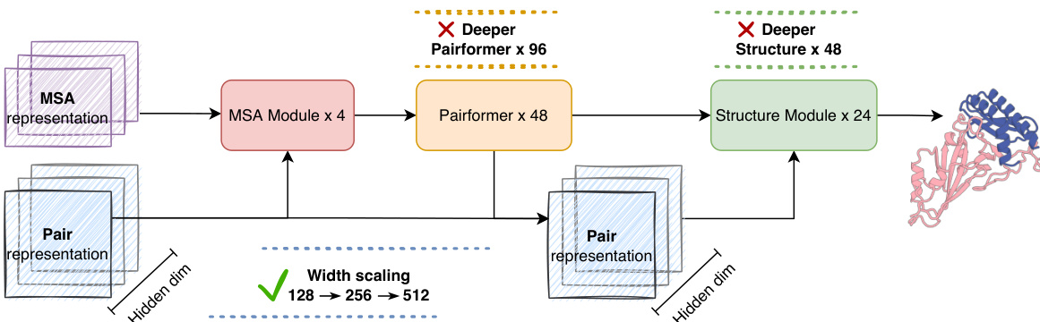 - The paper addresses the challenge of scaling biomolecular structure prediction models by identifying width scaling of the Pairformer as a key strategy to increase representation capacity, overcoming bottlenecks posed by fixed hidden dimensions in existing architectures.