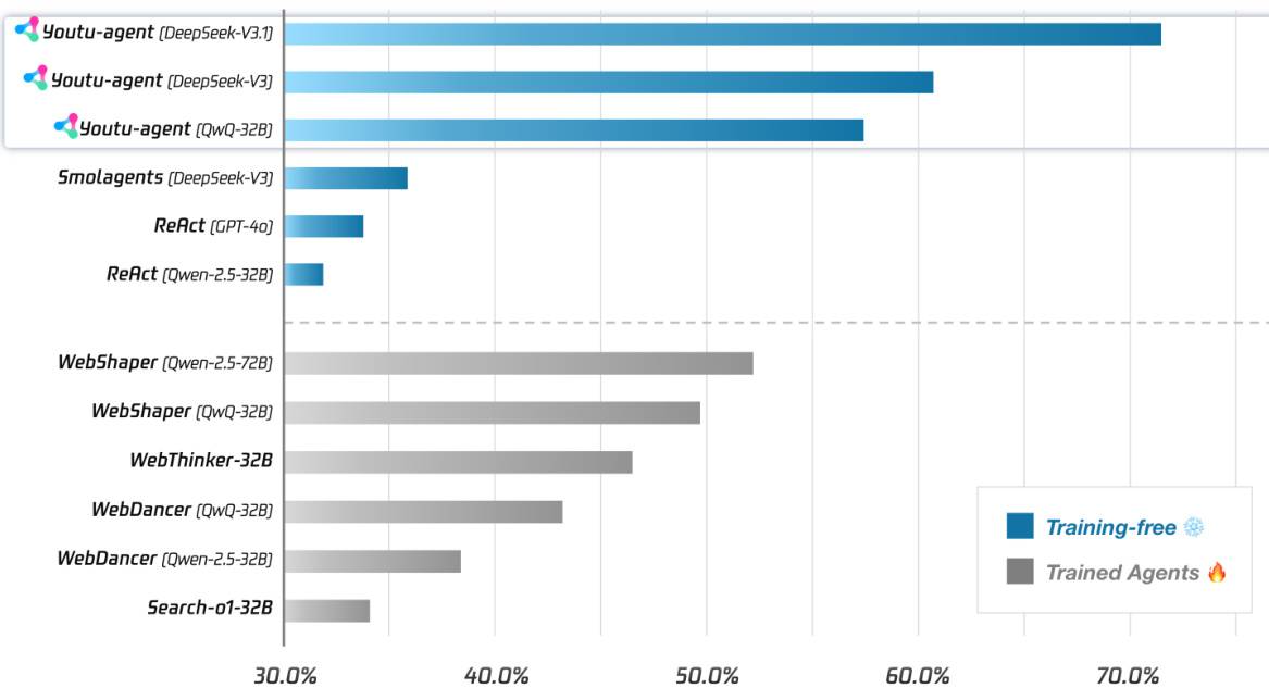The authors from Tencent Youtu Lab, Fudan University, and Xiamen University propose Youtu-Agent, a modular framework enabling automated generation of LLM agents via Workflow and Meta-Agent modes, with a hybrid policy optimization system combining training-free experience accumulation and scalable reinforcement learning, achieving state-of-the-art performance on WebWalkerQA and GAIA while reducing configuration costs and enabling continuous evolution without expensive fine-tuning.