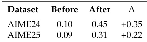 The authors use a training-free approach to improve agent performance on mathematical reasoning benchmarks, achieving +2.7% and +5.4% absolute improvements on AIME 2024 and AIME 2025 respectively, with no parameter updates and only 100 training examples. This demonstrates that experience accumulation through in-context learning can effectively enhance agent capabilities at low cost.