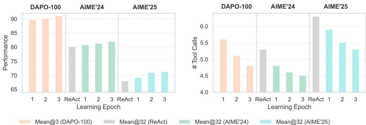 Results show that the Training-free GRPO method achieves consistent performance improvements across learning epochs on AIME 2024 and AIME 2025, with Mean@32 accuracy increasing from epoch 1 to 3. The number of tool calls decreases over epochs, indicating that the agent learns more efficient problem-solving strategies without parameter updates.