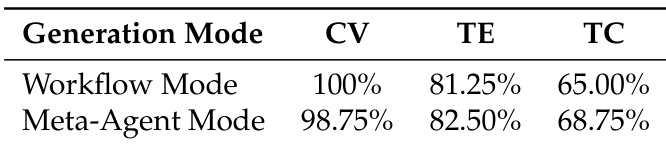 - Automated Agent Generation: The Workflow and Meta-Agent modes achieved 100% and 98.75% configuration validity, respectively, with 81.25%–82.50% tool executability and 65.00%–68.75% task completion, demonstrating effective automated tool and agent configuration synthesis.
