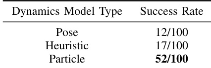 - Impact of the dynamics model: A particle-based dynamics model is crucial for success in tasks requiring rotation. It substantially outperforms alternative pose-based or heuristic models.