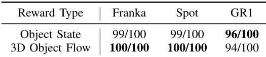 - 3D object flow as a policy reward: 3D object flow serves as an effective reward signal for training RL policies. Policies trained with this reward perform comparably to those using handcrafted state rewards across different robot embodiments (Franka Panda, Spot, GR1).