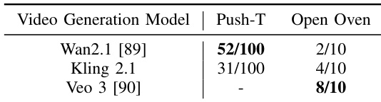 - Impact of the video model: Performance depends on the domain. Wan 2.1 excels in simulated tasks like Push-T, while Veo 3 performs best on real-world tasks like Open Oven. Other models can suffer from object morphing or incorrect articulation.