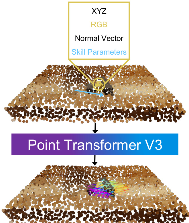 In the simulated Push-T domain, the system employs random shooting to sample multiple push parameters, predicts the resulting object motion using the learned dynamics model, and selects the action that minimizes the cost to the current subgoal. In the real-world setting, the optimization is performed using PyRoki, incorporating reachability, smoothness, and manipulability costs. The resulting end-effector trajectory is smoothed with a B-spline and executed using an inverse kinematics solver and a joint impedance controller. For the door opening task, the system trains a sensorimotor policy using Soft Actor-Critic, where the reward is derived from the 3D object flow, encouraging the robot to track the reference trajectory while staying near the object.