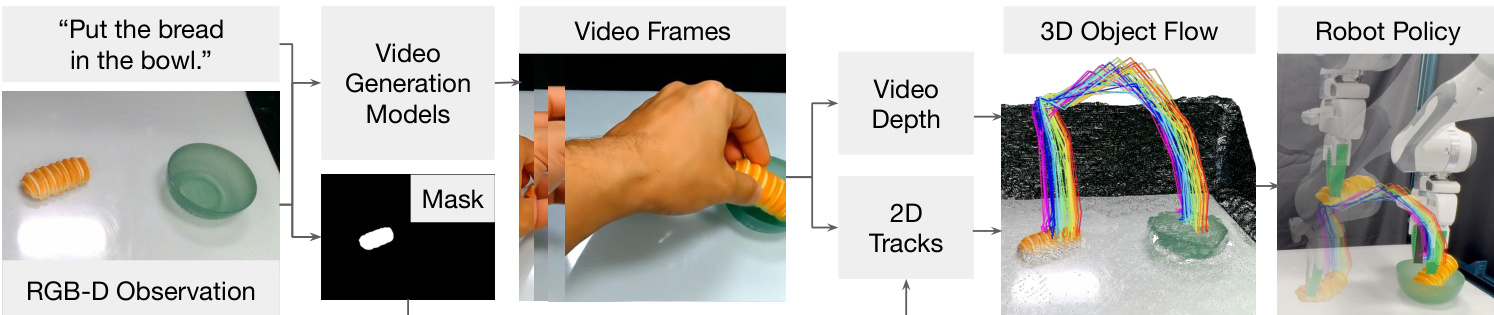 - The authors demonstrate an autonomous pipeline that generates a task video, extracts the 3D object flow, and synthesizes robot actions via trajectory optimization or reinforcement learning. This method effectively leverages the rich priors of video models to guide manipulation without directly mimicking human actions, cleanly separating the "what" from the "how" of a task.
