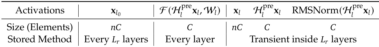 The authors use the table to detail the memory access patterns and storage requirements of the hyper-connection (HC) mechanism in a pre-norm Transformer architecture. Results show that HC increases memory access costs by a factor proportional to the number of residual streams, with activations stored every Lr layers for pre-activation inputs and transiently within Lr layers for post-activation inputs, leading to higher I/O demands and memory footprint.