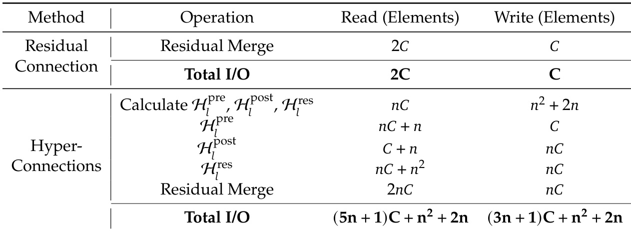 The authors use the table to quantify the memory access overhead introduced by Hyper-Connections (HC) compared to standard residual connections. Results show that HC significantly increases both read and write operations, with total I/O scaling quadratically with the expansion rate n, leading to a substantial rise in system-level overhead. This increased I/O cost, particularly the quadratic growth in writes, contributes to degraded training throughput and higher memory usage, highlighting a key limitation of HC in large-scale models.