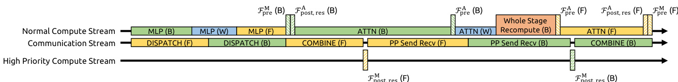 The communication-computation overlapping for mHC is illustrated in the DualPipe schedule. The schedule is designed to handle the overhead introduced by mHC, particularly the communication latency across pipeline stages and the computational overhead of recomputation. The figure shows the timeline for the normal compute stream, communication stream, and high-priority compute stream. The high-priority stream is used to execute the mHC kernels for MLP layers, ensuring that they do not block the communication stream. The recomputation process is decoupled from pipeline communication dependencies, as the initial activation of each stage is already cached locally. This allows for improved overlapping of communication and computation at pipeline stage boundaries.