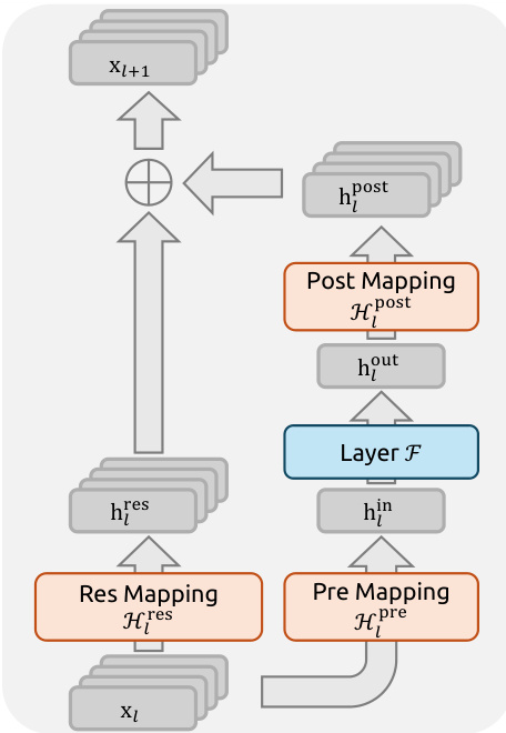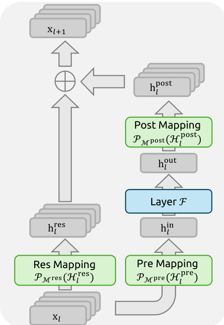 The authors leverage recent advances in macro-architecture design—particularly Hyper-Connections (HC), which expand residual stream width and diversify inter-layer connectivity—to improve model expressiveness and performance in large language models. However, prior HC methods suffer from training instability and poor scalability due to the loss of the identity mapping property, which disrupts signal conservation across layers, and incur high memory access overhead from widened feature representations. To address these issues, the authors propose Manifold-Constrained Hyper-Connections (mHC), a framework that projects residual connection matrices onto a doubly stochastic manifold using the Sinkhorn-Knopp algorithm, thereby restoring identity mapping and stabilizing signal propagation. This geometric constraint ensures convex combination-based feature flow, enabling robust large-scale training. Complementing this, mHC integrates infrastructure optimizations—including kernel fusion, recomputation, and overlapping communication in DualPipe—to minimize computational overhead. The result is a scalable, stable, and efficient extension of HC that preserves performance gains while enabling deeper and wider model architectures.