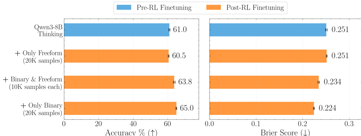• Reward design ablation shows that combining accuracy and Brier score improves both accuracy and calibration, outperforming baseline accuracy-only or Brier-only rewards; the hybrid reward reduces over-reliance on low-confidence "Unknown" predictions.