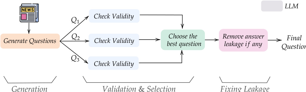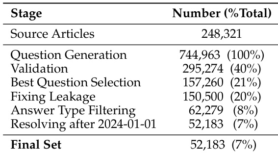 • After generation, the dataset undergoes multiple filtering stages: 60% of candidate questions are removed due to ambiguity or lack of clear resolution; articles yielding multiple valid questions have the best one selected via a sample selector (Llama-4-Maverick); numeric answers are excluded; and direct answer leakage is addressed through model rewriting, rejection, and a final string-matching filter.