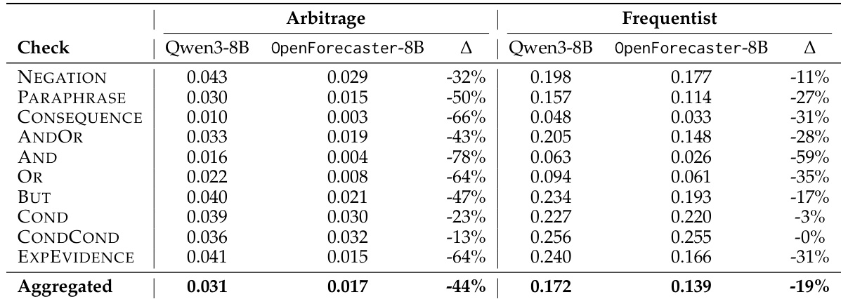 The authors use a table to evaluate the consistency of probabilistic predictions made by Qwen3-8B and the trained OpenForecaster-8B model on long-term forecasting questions. Results show that the trained model significantly reduces violation scores across most consistency checks, with a 44% reduction in arbitrage violations and a 19% reduction in frequentist violations compared to the baseline. This indicates that the training process improves logical consistency in the model's reasoning.