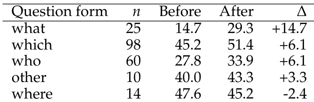 Results show that the model's performance improves significantly on questions of the form "what", "which", and "who", with average accuracy increases of 14.7, 6.1, and 6.1 points respectively. However, performance decreases on "where" questions, dropping by 2.4 points, indicating a specific weakness in location-based predictions.