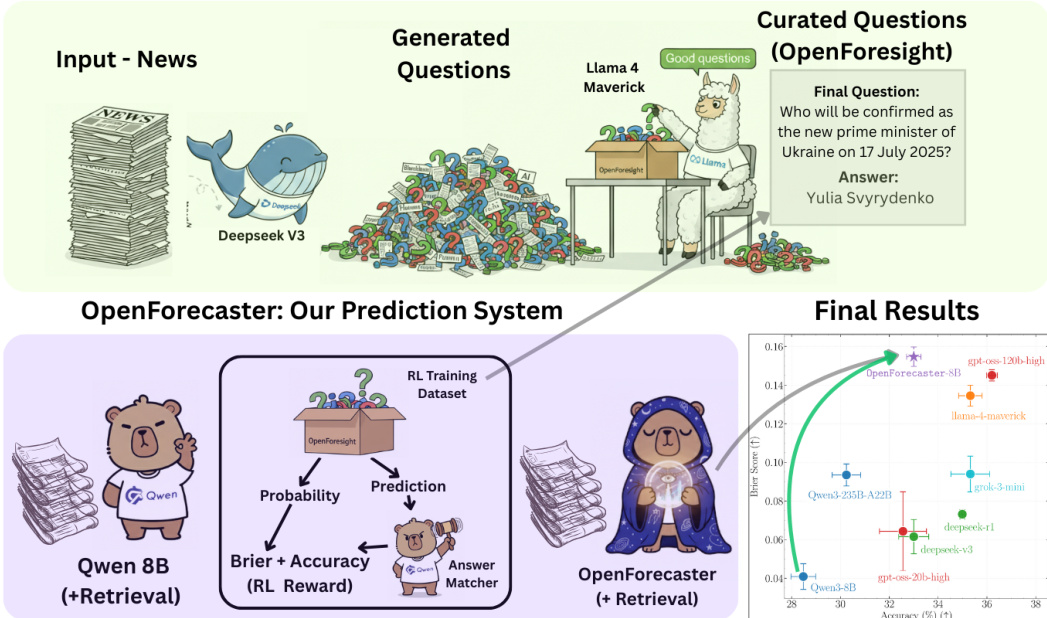 The authors from the Max Planck Institute for Intelligent Systems, ELLIS Institute Tübingen, Tübingen AI Center, and University of Tübingen propose OpenForecaster8B, a specialized language model trained on OpenForesight—a synthetically generated dataset of forecasting questions from curated news—using offline data to prevent information leakage, with retrieval and an improved RL reward function enhancing prediction accuracy, calibration, and consistency, outperforming larger proprietary models and generalizing across benchmarks, with all resources open-sourced.