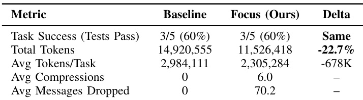 The authors evaluate the Focus architecture against a baseline agent on context-intensive software engineering tasks to test its ability to manage context efficiency. By utilizing frequent compressions and message dropping, the Focus approach significantly reduces total token consumption. Ultimately, the architecture maintains the same level of task success as the baseline while operating much more efficiently.