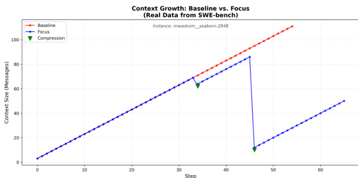 - Evaluations on context-intensive SWE-bench Lite instances demonstrate that the Focus agent achieves a 22.7% total token reduction while maintaining identical task accuracy compared to standard agents. Results show that the method performs an average of 6.0 autonomous compressions per task, with individual instance token savings reaching up to 57%.