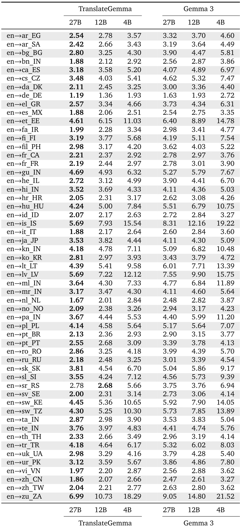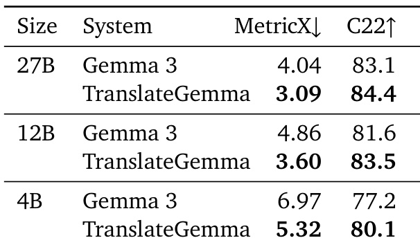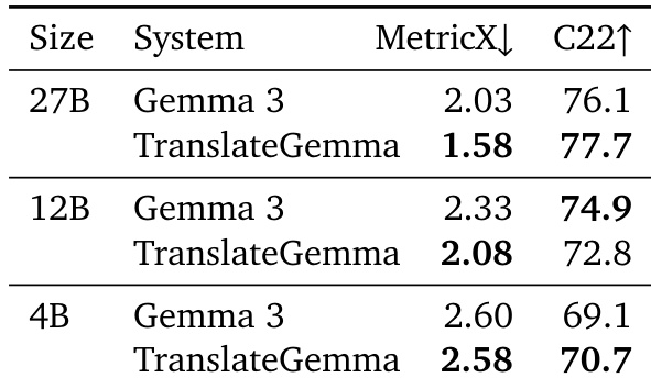 - COMET22 results confirmed improvements, with the 12B TranslateGemma scoring 83.5 (up from 81.6) and the 4B model reaching 80.1 (up from 77.2), demonstrating generalization beyond optimized metrics.