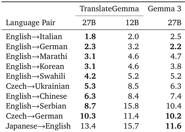 - Human evaluation on 10 language pairs using MQM confirmed TranslateGemma’s superiority in most cases, with notable gains in low-resource pairs (e.g., +1.6 for English→Marathi, +1.0 for English→Swahili), though a regression was observed in Japanese→English due to named entity errors.