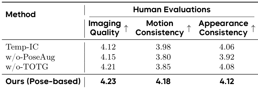 The authors evaluate ablated versions of their model against the full pose-based DreamActor-M2, showing that removing pose augmentation or target-oriented text guidance leads to lower scores across imaging quality, motion consistency, and appearance consistency. Results indicate that both pose augmentation and LLM-driven text guidance contribute meaningfully to the model’s ability to preserve structural detail and motion fidelity. The full pose-based variant achieves the highest human evaluation scores, confirming the effectiveness of the integrated design.