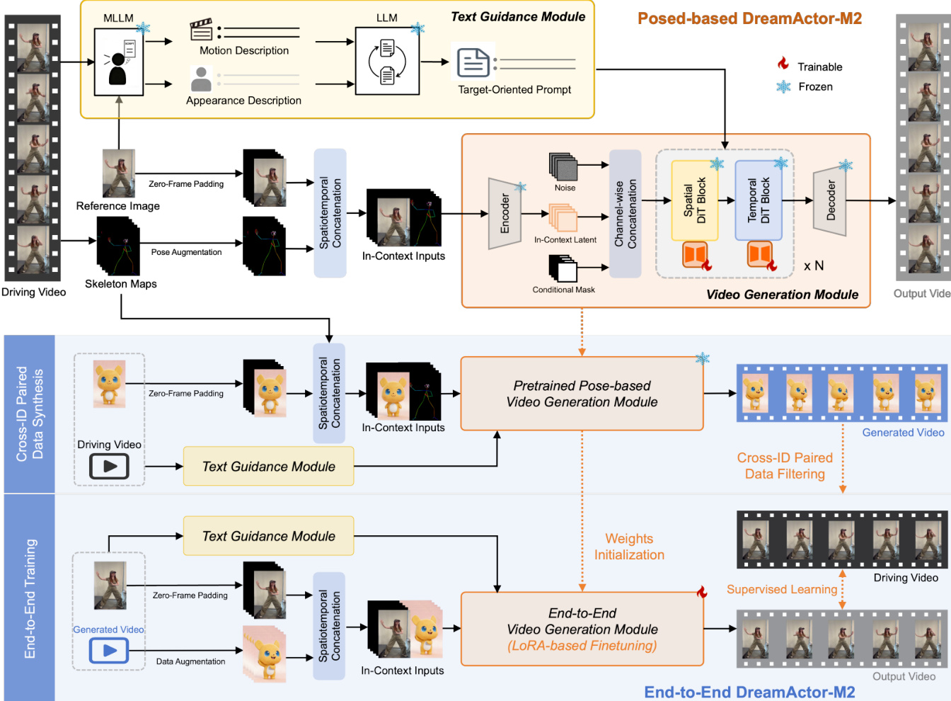 - DreamActor-M2 introduces a spatiotemporal in-context motion conditioning strategy that fuses appearance and motion into a unified latent space, enabling foundational video models to jointly preserve identity and motion without the “see-saw” trade-off.