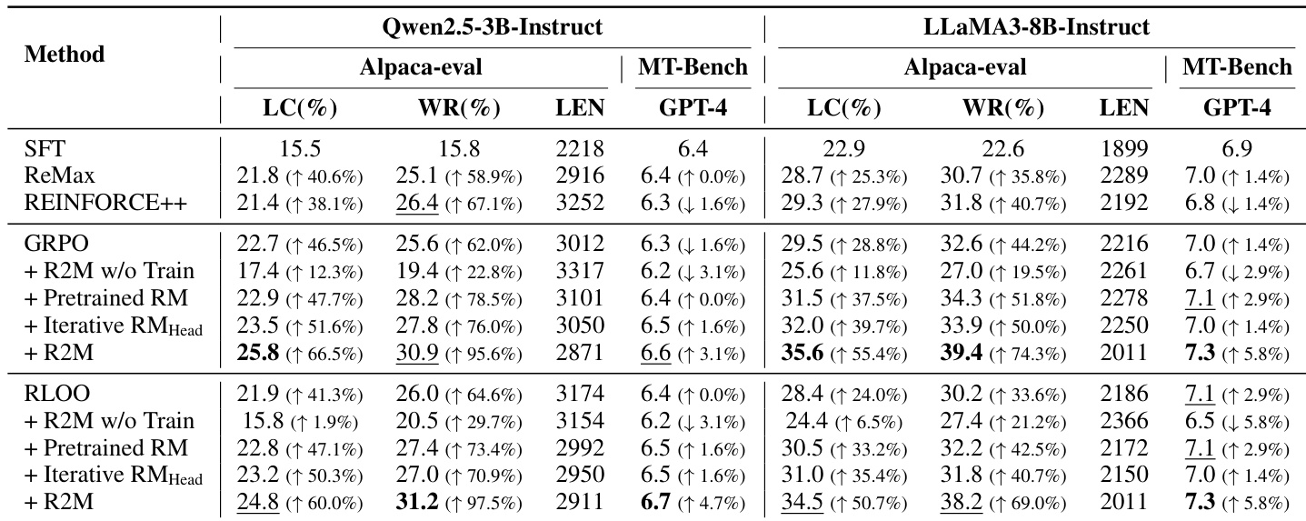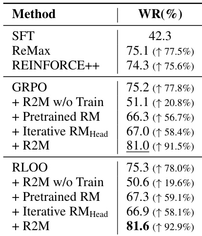 - Evaluated on UltraFeedback and TL;DR datasets, R2M boosts AlpacaEval win rates by 5.2%–8.0% and TL;DR win rates by 6.3% over baselines, demonstrating consistent gains with minimal added computational cost.