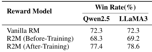 The authors integrate policy feedback into reward model training through R2M, which consistently outperforms baseline methods including frozen and noise-augmented variants. Results show that updating the reward model with policy-derived hidden states is essential for performance gains, as static or untrained feedback yields minimal improvement. The full R2M approach achieves the highest win rates, confirming that iterative alignment with policy dynamics enhances reward signal quality and model alignment with human preferences.