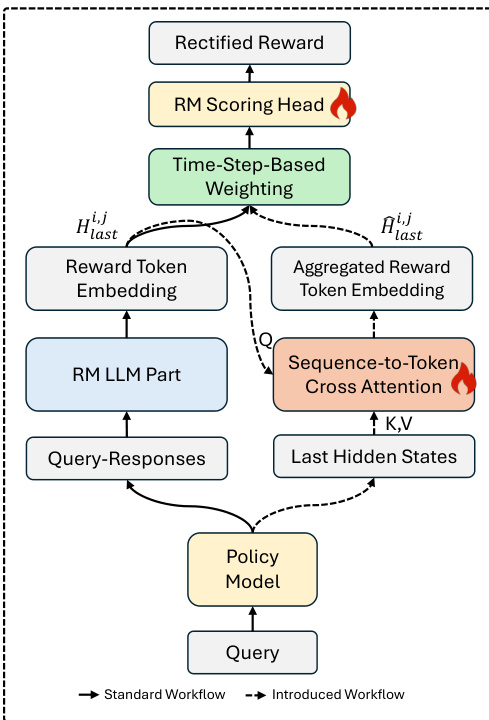 The authors leverage a novel architecture, R2M, designed to enhance the reward model during the RL optimization phase of RLHF by incorporating real-time policy feedback. The core innovation lies in structurally integrating the policy model’s internal hidden states into the reward model’s scoring mechanism, enabling the reward model to dynamically adapt to the policy’s evolving distribution. This is achieved through two key modules: a Sequence-to-Token Cross Attention mechanism and a Time-Step-Based Weighted Combination strategy, both operating within an iterative optimization loop.
