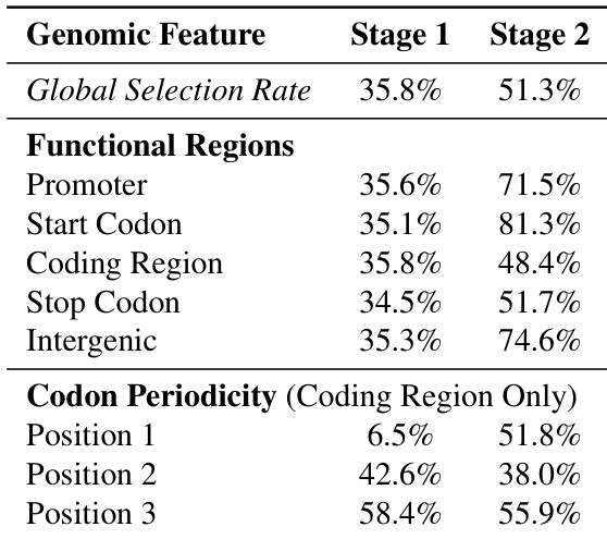 The authors analyze the learned hierarchical chunking boundaries of the dnaHNet model across different stages. The results demonstrate that the first stage captures local triplet codon structure, while the second stage identifies broader functional genomic organization. The first stage shows strong periodicity within coding regions, with selection rates varying significantly by codon position. The second stage exhibits higher selection rates for functional regions like promoters and intergenic areas compared to coding regions. The overall global selection rate increases from the first stage to the second stage.