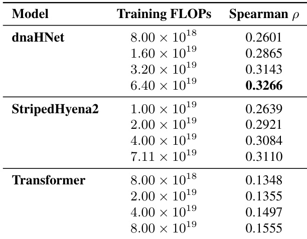 The authors evaluate the zero-shot protein variant effect prediction performance of dnaHNet against StripedHyena2 and Transformer baselines across various training compute budgets. Results show that dnaHNet consistently achieves higher Spearman correlation for predicting experimental fitness as training FLOPs increase. dnaHNet demonstrates superior predictive accuracy compared to both StripedHyena2 and Transformer architectures. The predictive performance of dnaHNet improves steadily as the amount of training compute increases. The performance gap between dnaHNet and the baseline models widens at higher training compute scales.
