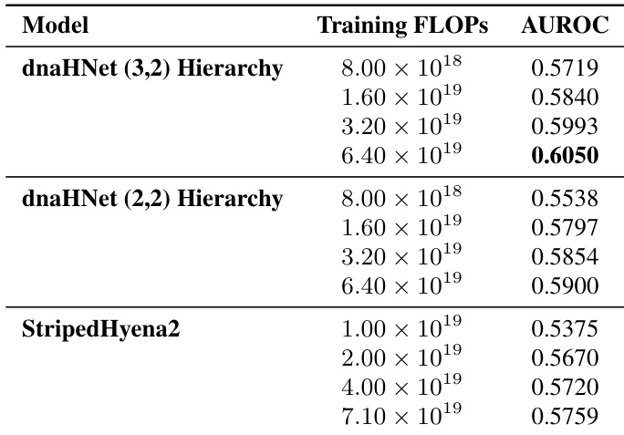 The authors compare the gene essentiality prediction performance of two dnaHNet hierarchical configurations against a StripedHyena2 baseline across various compute budgets. Results show that both dnaHNet architectures consistently outperform the baseline in AUROC as training compute increases. Both dnaHNet hierarchy versions demonstrate improved predictive accuracy as training FLOPs increase. The dnaHNet (3,2) hierarchy achieves higher AUROC scores compared to the (2,2) hierarchy at matched compute levels. dnaHNet models maintain a performance advantage over StripedHyena2 across the tested compute range.