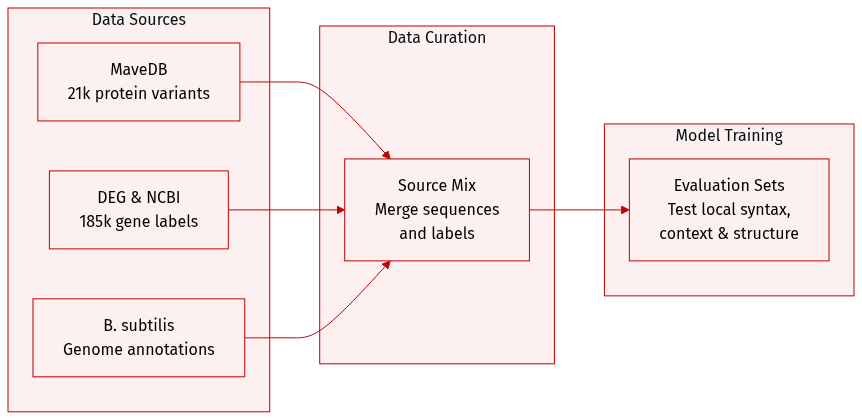 - Protein Variant Effects (MaveDB): This subset consists of 21,250 nucleotide-level data points compiled from 12 experimental fitness datasets for E. coli K-12. It is used to assess the model's ability to capture local coding syntax and predict protein fitness landscapes.