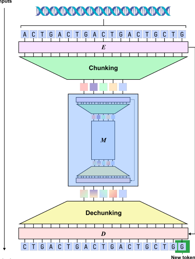 Genomic foundation models are essential for decoding DNA syntax to advance fields like drug discovery and synthetic biology. However, current approaches face a fundamental tradeoff between computational efficiency and biological accuracy. Fixed-vocabulary tokenizers are efficient but often fragment critical biological motifs like codons, while nucleotide-level models preserve biological coherence but suffer from prohibitive computational costs when processing long genomic contexts. The authors leverage a hierarchical, tokenizer-free architecture called dnaHNet to resolve this tension. By using a differentiable dynamic chunking mechanism, the model adaptively compresses raw nucleotides into latent tokens, allowing it to achieve superior scaling, faster inference, and state-of-the-art performance on zero-shot tasks such as protein variant fitness prediction.