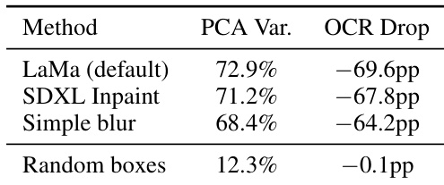 The authors conduct control experiments to ensure that the observed OCR suppression stems from actual text removal rather than artifacts introduced by inpainting. They compare three different inpainting methods against a random box baseline to validate the specificity of their PCA-based intervention. Different inpainting techniques yield similar levels of explained variance and OCR suppression The random box control shows minimal impact on both variance and OCR accuracy Results confirm that the identified signals are specific to text removal rather than general image perturbations
