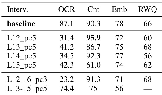 The authors evaluate different layer-wise interventions on the Qwen3-VL-2B model to observe the impact on OCR and visual reasoning tasks. Results show that interventions in the mid-network range can suppress OCR while simultaneously improving performance on certain visual tasks like counting. Interventions at specific mid-layers achieve significant OCR suppression while increasing counting accuracy Certain interventions provide a trade-off where counting improves but spatial reasoning and general visual QA scores decrease Multi-layer interventions can effectively reduce OCR with varying impacts on downstream visual reasoning tasks