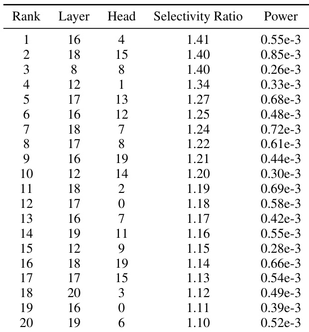 The authors identify the most OCR-selective attention heads by ranking them based on their selectivity ratio. These heads are primarily concentrated within specific mid-network layers. The most selective heads are located within layers 16, 18, 8, 12, and 17 Selectivity ratios for the top ranked heads range from approximately 1.10 to 1.41 A significant cluster of highly selective heads is found in the mid-layer range between layer 16 and layer 20