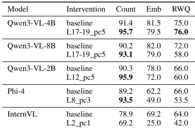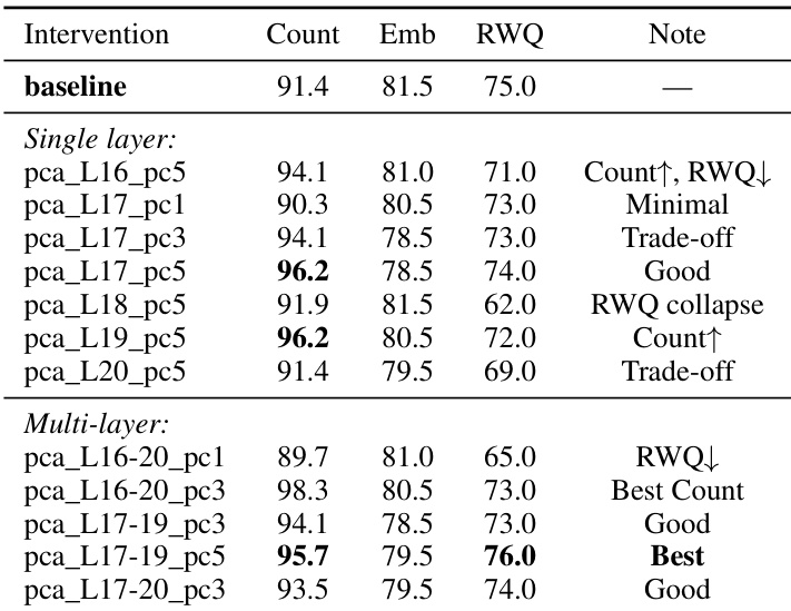 The authors evaluate different PCA-based interventions on the Qwen3-VL-4B model to identify optimal layers for OCR suppression. Results show that targeting specific mid-layer components can improve object counting performance while maintaining or slightly adjusting other visual reasoning capabilities. Multi-layer interventions at layers 17 through 19 achieve a favorable balance by improving counting and general visual QA with minimal impact on spatial reasoning. Single-layer interventions at layer 18 lead to a significant collapse in general visual QA performance. Certain mid-layer interventions, such as pca_L17_pc5, demonstrate effective trade-offs by increasing counting accuracy while preserving most other metrics.