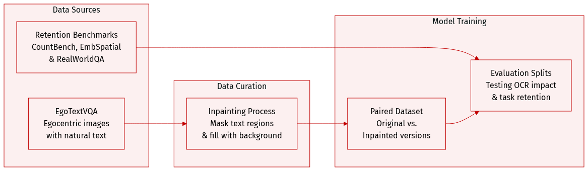 - Inpainting Processing: To generate the inpainted versions, the authors extract text region bounding boxes from existing annotations and expand them by 10 percent to ensure total coverage. They then apply a standard inpainting model to fill these masked regions. The quality of this process was verified through manual spot-checks of 50 random samples.