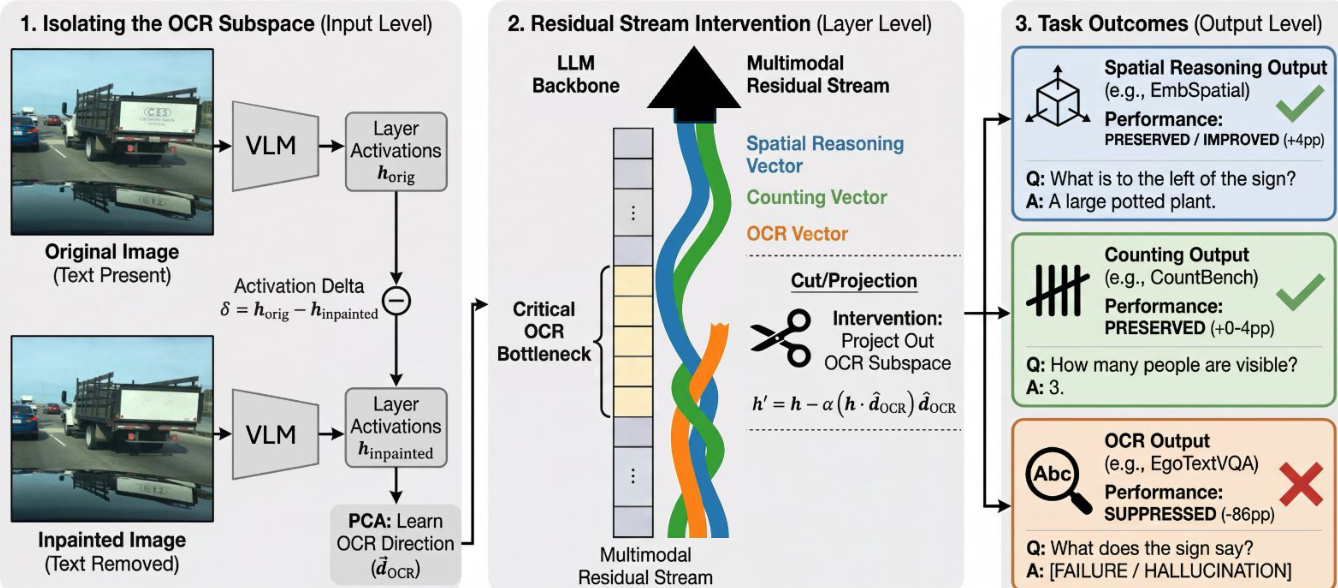 Vision-language models (VLMs) rely on optical character recognition (OCR) to interpret text within images, a capability essential for tasks ranging from document understanding to autonomous web browsing. While these models demonstrate strong text-reading performance, the internal routing mechanisms that transition visual text into the language processing stream remain poorly understood. This lack of clarity poses significant safety risks, as adversarial text embedded in images can be used to hijack model behavior through typographic prompt injections. The authors leverage causal interventions and Principal Component Analysis (PCA) to identify architecture-specific depth bands where OCR information is processed. They demonstrate that the OCR signal is remarkably low-dimensional and that its processing pathways are consistent across different datasets. Furthermore, the authors show that surgically removing this OCR subspace can actually improve performance on non-textual tasks like counting, suggesting that OCR circuits can interfere with other visual reasoning processes in certain model architectures.