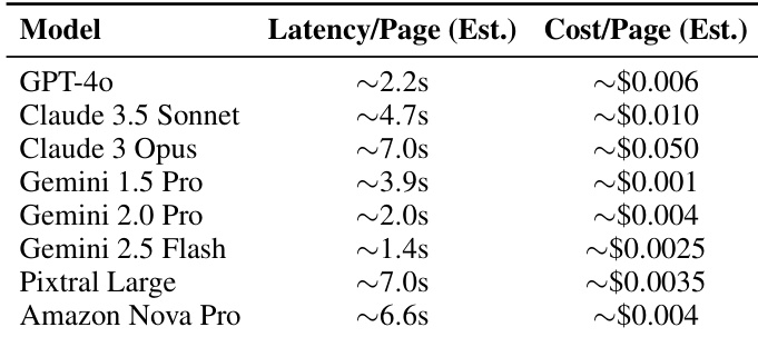 The authors provide an estimation of the inference latency and cost per page for several closed-source multimodal large language models. The results indicate a variety of performance profiles regarding speed and expense across different model providers. Models such as Gemini 2.5 Flash demonstrate lower latency and lower costs compared to others in the benchmark. There is a notable trade-off between speed and expense, with some high-performance models requiring significantly higher costs per page. Latency varies widely among the evaluated models, ranging from very fast responses to several seconds per page.