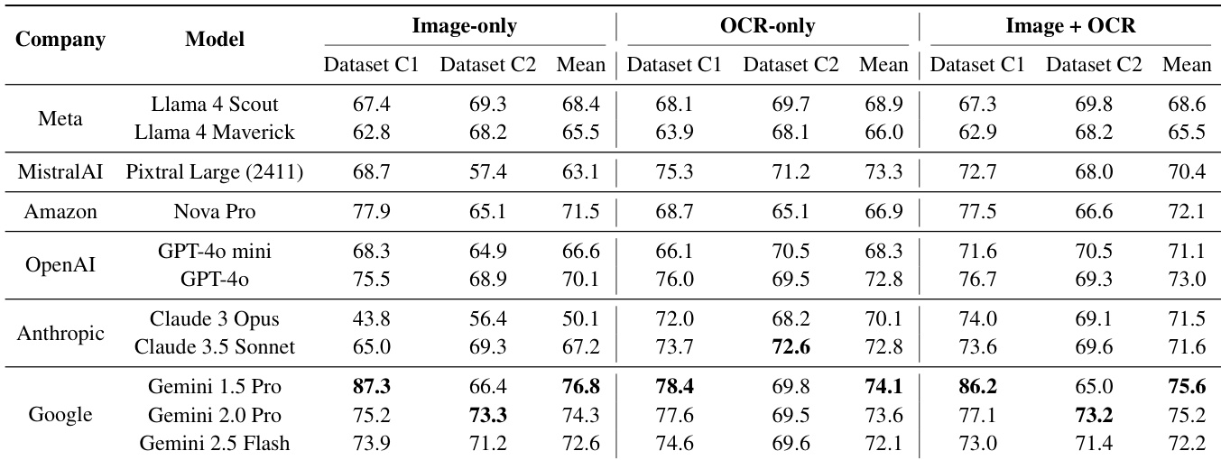 The authors compare the performance of various multimodal large language models across three input modalities: image-only, OCR-only, and a combination of both. The results demonstrate that while OCR-only inputs provide relatively stable performance, combining image and OCR inputs can lead to more robust predictions for many flagship models. Flagship models from Google show high performance in the image-only setting, sometimes even performing better without explicit OCR text. Combining image and OCR inputs tends to reduce performance variance compared to using image-only inputs. Certain models exhibit performance decreases when transitioning from OCR-only to multimodal inputs, suggesting potential difficulties in integrating visual and textual information.